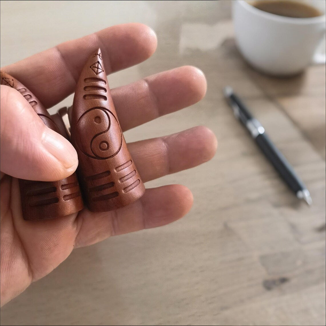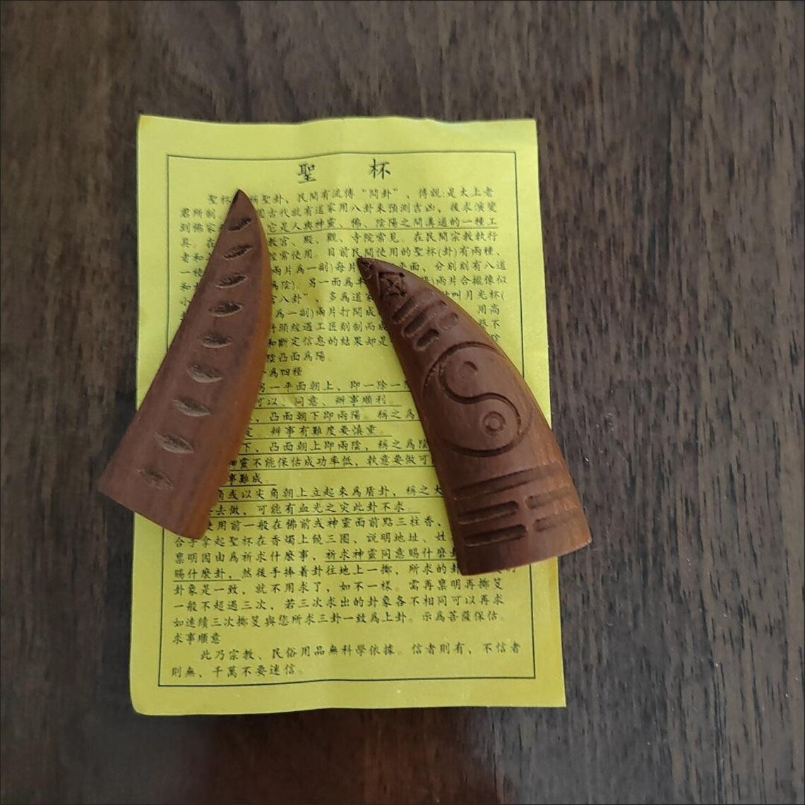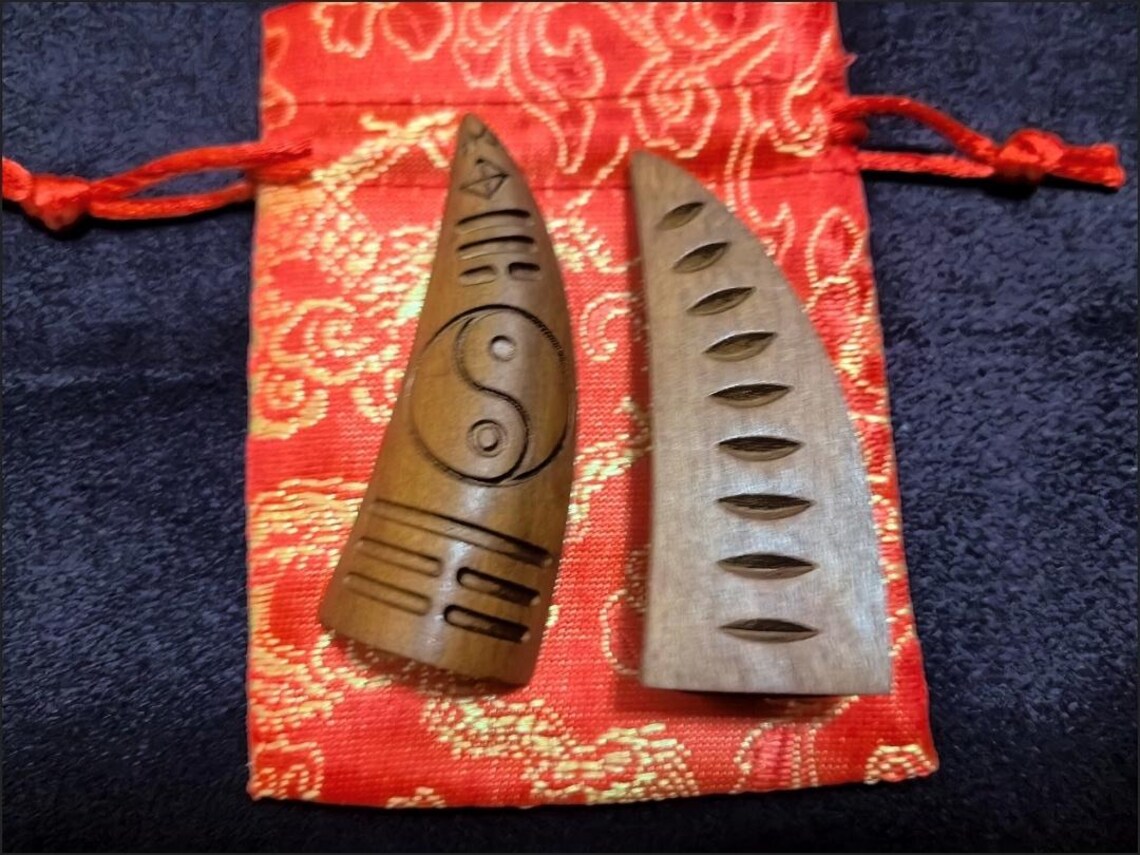 Traditionally used by Taoist practitioners for communicating with spiritual realms and seeking divine guidance. The unique notch pattern on each cup creates specific energy channels that help reveal answers to your questions. The lightning-struck wood is especially valued as it's believed to have been chosen by heaven, making these cups more powerful than ordinary divination tools for protection and spiritual insight.