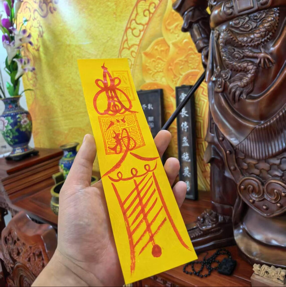 Crafted with reverence at the ancestral Xishan Wanshou Palace—the birthplace of Jingming Dao—this talisman channels centuries of Taoist wisdom. Each stroke is meticulously hand-drawn by Master Qiao Fadao, a 66th-generation ordained Taoist priest of Zhengyi Dao (Tianshi Dao), using traditional yellow paper and pure red cinnabar. Rooted in the teachings of Immortal Xu Xun, this talisman embodies the spiritual lineage of Master Qian Jingjiang and Grandmaster Bai He.